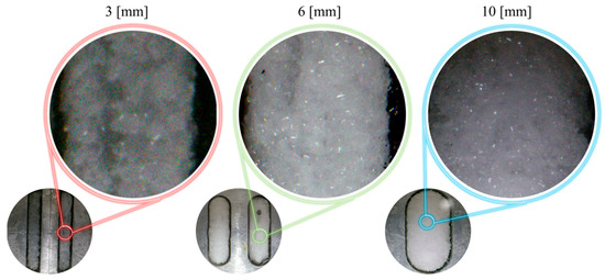 As illustrated in Figure 7, the hydrate growth process in fractures with varying widths is quite similar. Hydrates initially form at the fracture wall and subsequently expand toward the left and right sidewalls. The hydrates come into contact, collide, and aggregate, ultimately filling the entire fracture. This occurs because, within the fissures, hydrate growth is significantly influenced by capillary effects. Capillary action draws water molecules toward the fissure surfaces, where hydrates preferentially nucleate. Notably, various morphological characteristics of the hydrate were observed under varying fracture widths, as shown in Figure 8. Furthermore, in fractures with a 3 mm width, the hydrate predominantly adopts a dense, strip-like morphology (Figure 8(A1,A2)). This is due to the narrow fracture space, which limits the development of the hydrate’s morphology, causing it to grow primarily along the fracture sidewalls, thereby forming a dense, strip-like structure. In fissures with a width of 6 mm, the increased fissure space promotes additional reactions and expansion of hydrates at the gas–liquid interface, with the morphology transitioning from a strip-like to a plate-like structure (Figure 8(A3,A4)). This transformation can be attributed to changes in the flow conditions within the fissure, which increase the contact surface between the gas and liquid. The expansion of the hydrates within the fissure is influenced by fluid dynamics, thereby facilitating the formation of plate-like hydrates. An additional increase in fissure width (10 mm) encourages a looser morphology of the hydrates, leading to the formation of a flocculent structure (Figure 8(A5,A6)). This is because, in larger fissure spaces, the diffusion of gas and water molecules becomes freer, and the formation of hydrates is no longer constrained by narrow spaces, thereby forming a more loosely structured, flocculent morphology.