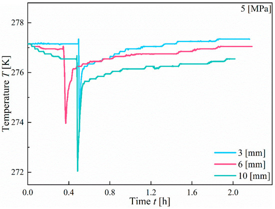 The changes in environmental temperature during hydrate dissociation are analyzed, as shown in Figure 17. It was observed that the temperature initially increased briefly and then decreased rapidly. This phenomenon may be attributed to the endothermic process during the early stage of hydrate dissociation, in which the released water rapidly freezes at low temperatures, releasing heat and forming concentrated thermal energy. Additionally, the gas produced during hydrate dissociation may expand and contract, potentially causing localized temperature increases. As the dissociation process progresses, the released methane and water molecules transport heat away from the surrounding environment. Meanwhile, heat exchange between the system and its local environment further reduces the overall temperature. Therefore, the temperature rapidly decreases after a brief increase.