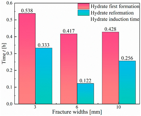 Figure 5a presents a comparison of hydrate induction times under varying fracture width conditions. As shown in the figure, under identical pressure conditions, the hydrate induction time for Type I fractures with a 3 mm width is longer than for the other two widths. The hydrate induction time for the 3 mm fracture width is 0.539 h, whereas for the 10 mm fracture width, the induction time decreases to 0.428 h, reflecting a 20.59% reduction. This phenomenon may be attributed to the fact that the fracture width affects the gas diffusion rate and fluid flow within the fracture. In smaller widths, both gas diffusion and fluid flow are restricted, impeding the gas mass transfer process, which consequently affects the hydrate induction time. Furthermore, the crystal growth of the hydrate is restricted, resulting in smaller crystal volumes and higher specific surface areas. Under constant liquid surface tension, the more pronounced the interface interactions, the less stable the formed hydrate. However, under identical pressure conditions, the hydrate induction times for fractures with 6 mm and 10 mm widths are almost identical. This suggests that as the fracture width increases, the space required for hydrate crystal nucleation is sufficiently provided. At this point, gas diffusion is more likely to reach a balanced state, resulting in a more uniform distribution of gas and liquid within the fracture, thereby minimizing the effect of fracture width on the hydrate induction time once the threshold (6 mm) is surpassed. Furthermore, fluctuations in induction times for the 6 mm and 10 mm widths may primarily be due to the randomness of hydrate nucleation and the effect of pressure on gas solubility.