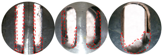 As shown in Figure 15, during the early stages of hydrate dissociation in fractures with varying widths, dissociation initiates at the surface in contact with the fracture and gradually propagates inward. This may result from the higher thermal conductivity of the solid, which preferentially triggers hydrate dissociation. As dissociation progresses, the morphology of the hydrate becomes irregular, especially as the fracture width increases. This phenomenon is more pronounced in wider fractures, which may be attributed to the more uniform heat transfer in narrower fractures, where heat diffuses from the fracture walls toward the interior. This leads to the formation of residual hydrate distributions that resemble the shape of the fracture cavity. In contrast, in wider fractures, due to the larger cavity volume, heat diffusion is uneven, and the hydrate dissociates more in the hotspot areas, resulting in irregular residual hydrate formations. Upon examining the microscopic morphology of the residual hydrate, a wave-like undulating surface is observed, as shown in Figure 16. This may result from the uneven pressure gradient changes inside the fracture, where hydrate dissociation occurs more slowly in areas of higher pressure and more quickly in areas of lower pressure. Additionally, temperature gradient variations induced by hydrate dissociation further accelerate the development of this phenomenon.