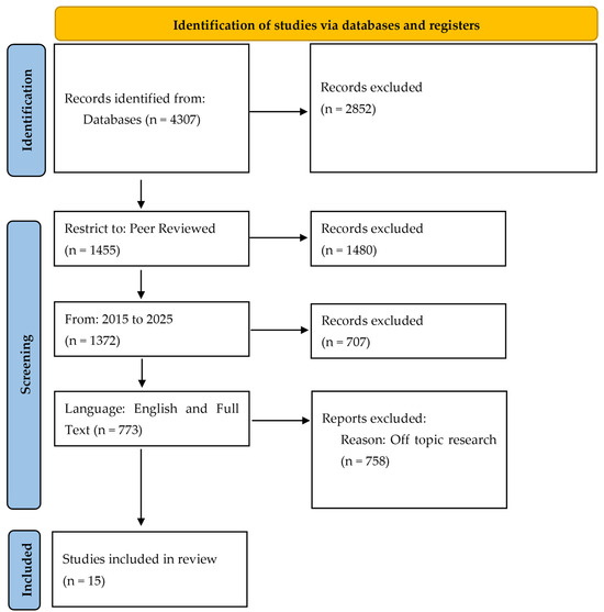 Following the application of the filters, a review was conducted of the titles, keywords, and abstracts of each article to identify those directly relevant to the research. Initially, a total of 4307 articles were retrieved. After the application of the filters, 773 articles remained, of which only 15 were found to be aligned with the research topic.