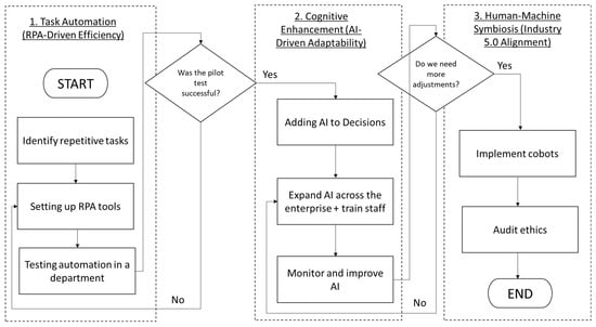 The successful implementation of Robotic Process Automation (RPA) and Artificial Intelligence (AI) within Industry 5.0 requires a structured, phased approach that harmonizes automation with human collaboration. This section introduces a novel framework designed to guide organizations in adopting these technologies systematically, addressing both technical and strategic dimensions.