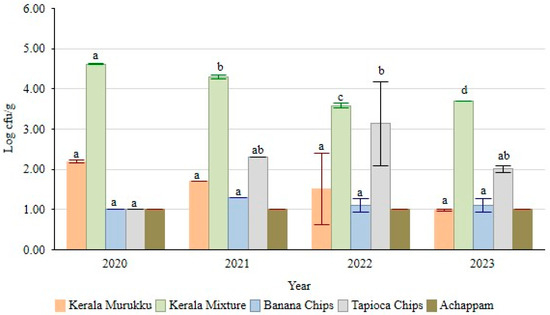 Total Plate Count (log CFU/g) in five traditional Indian fried snack products from 2020 to 2023. Bars indicate mean values ± standard deviation. The x-axis groups products by year. Superscript letters denote statistically significant differences between years within each product (p < 0.05). Means sharing the same letter are not significantly different. Superscripts are only shown for products with significant ANOVA results.