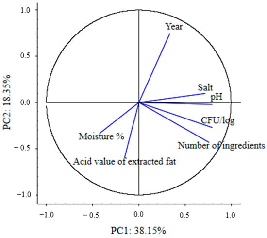 The correlation analysis further reveals that CFU/log moderately correlates with pH (r = 0.52) and salt content (r = 0.50), suggesting microbial activity is influenced by these parameters. The number of ingredients also positively correlates with CFU/log (r = 0.57) and pH (r = 0.57), indicating that more complex formulations may impact microbial stability. Moisture content is negatively correlated with pH (r = −0.35) and CFU/log (r = −0.28), suggesting that drier products may exhibit lower microbial counts and different pH characteristics. The acid value of extracted fat showed weak correlations with other variables, except for moisture (r = 0.14). In addition, the positive and negative correlations obtained from PCA were further confirmed by Spearman’s correlation method. In addition, Spearman’s test shows a strong negative relationship of acid value of extracted fat with years (p = −0.56, r = −0.18), indicating improved oil stability over time, likely due to enhanced filtration practices and reduced re-use of frying oil post-certification.