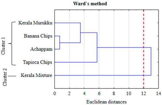 Dendrogram illustrating the hierarchical clustering of the five fried snack products based on their mean Total Plate Count (log CFU/g) values from 2020 to 2023, using Ward’s method with Euclidean distances. The red dotted line represents the cut-off point (Euclidean distance ≈ 12) used to determine the clusters.