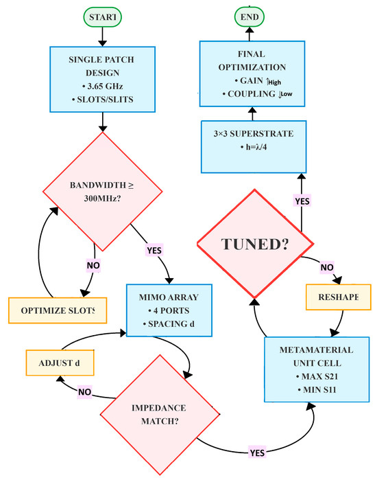 Designing an antenna for indoor communication is founded on three steps: the first step involves the design of a rectangular microstrip feed unit element, the second step involves the design of the unit element of the MTM and the whole 3 × 3 MTM superstrate, and the last step gives the design of a four-port MIMO array with a 3 × 3 MTM superstrate above a radiating array. Figure 1 illustrates the systematic design workflow for the four-port MIMO antenna array, detailing the iterative optimization process from the initial patch configuration to the final metamaterial-enhanced implementation.