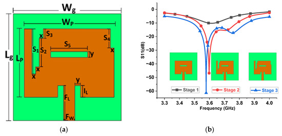 Overall dimensions of the unit element are 37.5 × 37.5 × 1.6 mm3. Figure 2 clarifies the design stages, final design, and the corresponding S-parameters of the unit element. Table 2 provides detailed design parameters and their corresponding values in millimeters for the proposed antenna unit element. The proposed design achieves the required impedance bandwidth of more than 300 MHz (3.5–3.8 GHz).