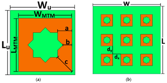 To enhance MIMO antenna performance parameters a superstrate consisting of a 3 × 3 grid of identical structures is designed on a 1.6 mm thick FR-4 substrate as shown in Figure 3b. A single element of the grid is depicted in Figure 3a, which is based on a metallic rectangular patch of dimensions 13 × 13 mm2 with an octagram star-shaped slot at its center. The octagram star-shaped slot was selected after iterative simulations comparing rectangular, circular, and star-shaped slots. The design parameters of the MTM unit cell and 3 × 3 MTM are listed in Table 3. The octagram design maximized resonance paths, resulting in a 3.5 dB gain enhancement. Starting from a conventional rectangular slot in a rectangular patch, the design was enhanced by superimposing a 45° rotated version of the slot, creating the octagram configuration. The star-shaped perforations were chosen over a simple slot loop as they create multiple resonant paths due to their multiple angular branches. These paths redirect the electromagnetic fields from the underlying MIMO radiators, resulting in enhanced gain and improved radiation characteristics.