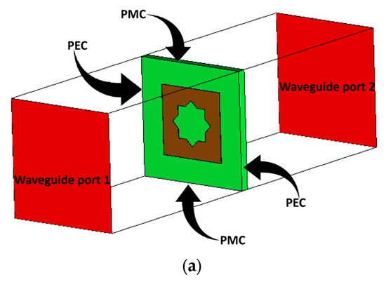 The metamaterial unit cell was placed in a rectangular waveguide environment, with Port 1 positioned at a λ/4 distance from the structure facing the metallic elements, and Port 2 positioned at a λ/4 distance on the opposite side, facing the substrate, as shown in the simulation setup of Figure 4a. The port separation distance was calculated based on the center frequency of 3.65 GHz, resulting in λ/4 ≈ 20.5 mm. This λ/4 distance ensures optimal impedance matching and minimizes reflections at the port interfaces, providing accurate S-parameter measurements. The simulation employs periodic boundary conditions to replicate the behavior of an infinite array. Electric boundary conditions (Et = 0) were applied along the x-axis, creating perfect electric conductor (PEC) walls, while magnetic boundary conditions (Ht = 0) were applied along the y-axis, creating perfect magnetic conductor (PMC) walls. Open boundary conditions with additional space were implemented at Zmax and Zmin to allow electromagnetic wave propagation in the z-direction. These boundary conditions simulate the periodic nature of the metamaterial structure while enabling proper wave propagation analysis.