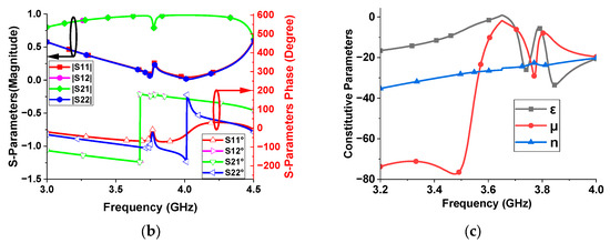 and with the sign of z selected to ensure and adjusted via . The real part branch was determined iteratively using Equation (9) ensuring continuity and satisfying . The final mu and epsilon were obtained as µ= nz and ε= n/z, with results validated across the frequency range. Figure 4b illustrates the magnitude of the S-parameters on a linear scale, along the left y-axis, and the phase characteristics of the proposed unit cell as obtained through waveguide analysis along the right y-axis. The reflection coefficients |S11| and |S22| demonstrate values below 0.25 approaching zero across the operational bandwidth, while the transmission coefficients |S12| and |S21| exhibit near-unity magnitude throughout the frequency range. Figure 4c presents the extracted constitutive parameters, revealing negative values for both relative permittivity and permeability across the band of interest.