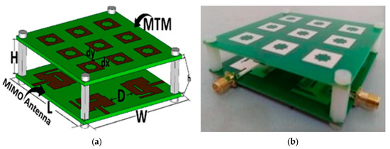 The designed 3 × 3 superstrate sheet will be positioned above the radiating antennas at a distance of 0.182λ0 (15 mm), where λ0 represents the wavelength calculated at 3.65 GHz. The interelement spacing of 0.11λ0 (9 mm) was selected to achieve optimal mutual coupling reduction while maintaining constructive interference between adjacent unit elements, resulting in enhanced gain and port isolation for the MIMO antenna system.