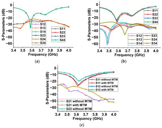 The scattering parameters of the antenna, both with and without MTM, are analyzed in Figure 6. The reflection coefficients of all ports with and without MTM remain less than −10 dB for almost the whole band of concern (i.e., 3.5–3.8 GHz). In comparison, using MTM |S11|, the resonating frequency shifts from 3.6 GHz to dual frequencies, 3.6 GHz and 3.75 GHz. Specifically, the maximum port isolation scattering parameters of adjacent ports in the case of without MTM are above −30 dB. However, using the MTM superstrate, the port isolation is reduced compared to the case without MTM. Despite a minor shift in the reflection coefficient dip caused by the MTM, the structure improves the proposed antenna’s mutual coupling capability.