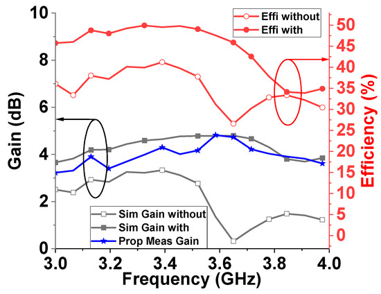 Simulated Gain with and without MTM and Proposed antenna measured Gain, Left y-axis. Simulated Efficiency with and without MTM superstrate on the Right y-axis.