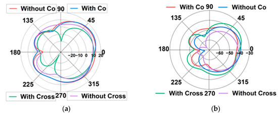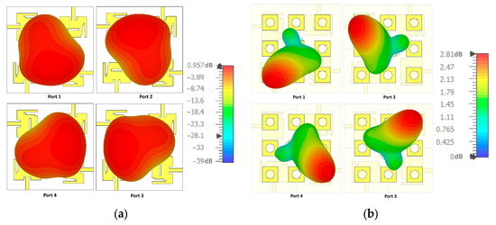 A comparison of the antenna’s effectiveness with and without metamaterial integration is presented in Figure 8, which depicts the simulated radiation patterns for both (a) E-field and (b) H-field distributions. The E-field pattern demonstrates that the metamaterial implementation maintains the radiation characteristics while enhancing the pattern stability around the broadside direction. The H-field plots reveal improved cross-polarization suppression with the inclusion of metamaterials, achieving levels between −30 and −60 dB. This enhancement in polarization purity and pattern symmetry across both fields validates the effectiveness of the metamaterial structure. Figure 9 compares 3D radiation patterns at 3.6 GHz for the MIMO antenna with (a) and without (b) a metamaterial (MTM) layer. With the MTM, the patterns are more focused, showing higher intensity and directionality, which increases gain and reduces coupling between ports, improving isolation. This highlights the MTM’s role in enhancing directivity and port isolation.