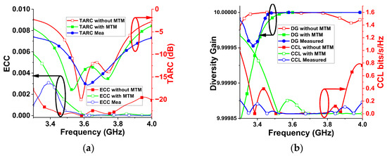 Four key diversity parameters must be considered for proper MIMO antenna operation in a wireless communication system: envelope correlation coefficient, total active reflection coefficient, diversity gain, and channel capacity loss. For antenna elements in a MIMO system, ECC measures the correlation between radiation patterns. The ECC ranges from 0 (complete isolation) to 1 (complete correlation). Generally, < 0.5 is considered acceptable for the appropriate operation of MIMO. The proposed MIMO antenna exhibits a very low value of ECC for any adjacent radiating element about less than 0.002 as shown on the left y-axis of Figure 10a. ECC is calculated from the formula given in Equation (10). It is noted that ECC remains lower when the MTM superstrate is used for frequencies ranging from 3.6 to 3.8 GHz.