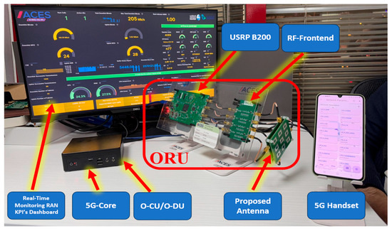 To evaluate the performance of the proposed antenna in a real-world scenario, a proof-of-concept testbed of a private 5G network based on ORAN split option 7.2 is implemented. Different components of the 5G network with the proposed antenna are illustrated in Figure 11. ACES in-house builds the radio frequency front end. For O-RU services, we utilized a commercially available, off-the-shelf SDR Ettus USRP B200. The srsRAN open-source software radio suite is installed on Ubuntu 22.04 for O-CU/O-DU services [30].