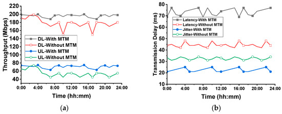 The metamaterial superstrate significantly enhanced both downlink and uplink throughput stability, maintaining consistent downlink throughput of approximately 200 Mbps and uplink throughput of nearly 70 Mbps throughout the 24 h period. In contrast, the antenna without MTM exhibited considerable throughput fluctuations, with dramatic drops of up to 30 Mbps in downlink and 25 Mbps in the uplink during peak usage hours (8:00–20:00), demonstrating the MTM design’s superior resilience to network congestion as depicted in Figure 12a. From Figure 12b, the implementation of the metamaterial resulted in a consistent 25–30 ms increase in transmission latency across all times, attributable to the additional signal processing complexity within the MTM structure. However, this design choice significantly reduced jitter by approximately 10 ms compared to the conventional antenna, demonstrating that the metamaterial superstrate effectively stabilizes signal propagation at the expense of slightly higher transmission delay.