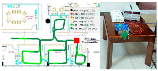A walk test was conducted in a designated indoor scenario to evaluate the performance of reference signal received power (RSRP) using INOS Digis Wireless RF processing tools, with the testing setup positioned in front of the exit door as indicated in the building’s floor plan in Figure 13. The results demonstrated robust signal coverage, with an excellent RSRP of more than −75 dBm observed across over 75% of the coverage area, ensuring strong signal quality for the majority of the space. Additionally, a good RSRP level exceeding −85 dBm was recorded in approximately 24% of the area, further highlighting the effectiveness of the setup. The signal strength distribution, ranging from −120 dBm to −75 dBm, was mapped across the floor plan, providing a comprehensive overview of the wireless performance in this indoor environment.