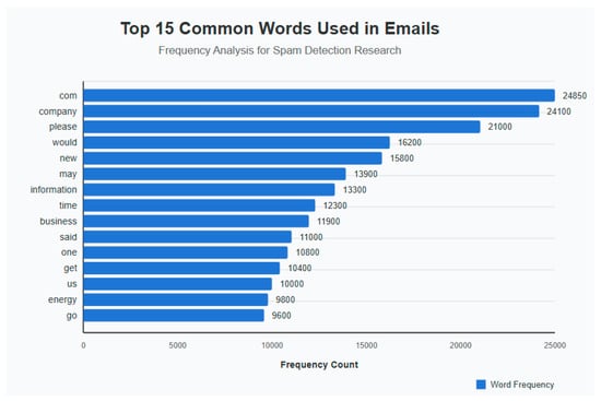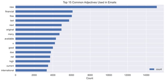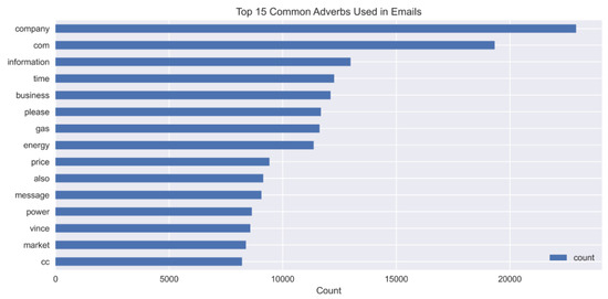 We counted the frequency of each adjective (Figure 3), adverb (Figure 4), and the top 15 nouns (Figure 5) usage, showing relevant patterns for spam detection within the respective figures. Company and the domain indicator com appear most frequently, which indicates business references in emails. Professional and marketing-oriented content receives attention in emails since words including ‘information’, ‘business’, and ‘message’ appear often. The presence of ‘gas’, ‘energy’, and ‘price’ points to industry-related spam emails. The appearance of the word ‘please’ points both to phishing activities and formal pleas within fraudulent email correspondence. These two words indicate financial interests, which are prevalent in spam emails. Using the abbreviation cc in the email indicates messages sent to multiple recipients or distributed by forwarding, which specifically relates to spam activity. The analysis technique detects recurrent language features that establish a distinction between spam and nonspam emails. The graph in (Figure 6) displays the 15 primary email words that researchers investigated regarding their use in spam detection. The horizontal bar chart shows word occurrence statistics where ‘com’ and ‘company’ stand as the two most occurring terms, possibly because of domain usage alongside business correspondence. The word ‘Please’ occurs frequently while representing polite petitions since phishers commonly employ it in their communications. The usage of ‘information’ together with ‘business’ indicates that the content revolves around professional and promotional aspects. The words ‘gas’ and ‘energy’ suggest that the message sender operates in an industrial sector. The collection contains legitimate and spam emails, which enables researchers to find distinctive features between them. The language combination of ‘new’ and ‘would’ frequently appear in promotional messages that use persuasion tactics.