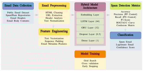 The proposed system for spam email detection follows a structured process to determine whether a given email message falls into the spam category. The system begins by collecting email data from public repositories and datasets. Following data collection, it undergoes an email preprocessing phase that includes three key operations: HTML cleaning, URL extraction, and text normalization. Next, a transformation phase converts text data into vectorized values before additional metadata is incorporated into the dataset. The foundational structure of the system comprises three main components: an embedding layer, GRU, and LSTM layers, which collaborate to produce a final output via a dense layer for the classification process. The model employs training methods such as cross-validation and grid search to optimize performance. Finally, the system evaluates spam detection capabilities using metrics like accuracy, F1-score, and ROC/AUC to categorize emails and assign confidence scores. Having stated that, it can be said that the proposed study is original in its own way since it suggests a hybrid deep learning model, and the concept of incorporating LSTM and the Gated Recurrent Unit (GRU) networks to identify spam email can be regarded as original as well. This type of model has the vanishing gradients and complexity problems that are attributed to deep sequence modeling. The emails also have features that define the text, which are improved through the employment of good preprocessing techniques in the model. Overall, the work offers a scaleable, efficient, and deployable resolution in reality to bridge the gap between the theory of deep learning and the reality of spam detection needs.