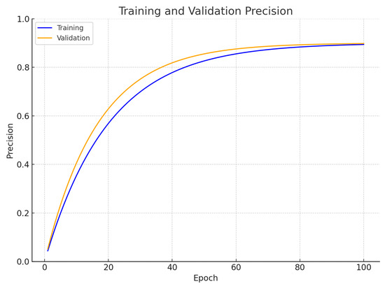 The model in (Figure 9) shows its precision capabilities through its identification of positive cases relative to all properly classified positive outcomes. The model achieved 89% training precision and was validated with 90% precision in both measurements. The model demonstrates high precision in its positive predictions because it only produces a limited number of false positives. The matching precision values between training and validation data illustrate the model’s ability to sustain high accuracy during training on unknown inputs, which indicates a strong ability to generalize and to be trusted in practical applications. Through precision measurement, the model proves its ability to separately categorize classes without many erroneous predictions.