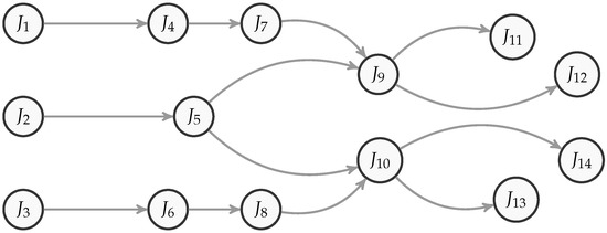 Exemplary production path represented by acyclic directed graph; jobs have no predecessors (start production path), jobs have one predecessor, jobs have two predecessors.