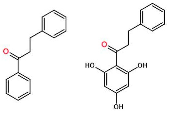 Dihydrochalcone (left) and pinocembrin dihydrochalcone (3-phenyl-1-(2,4,6-trihydroxyphenyl)-1-propanone) (right).
