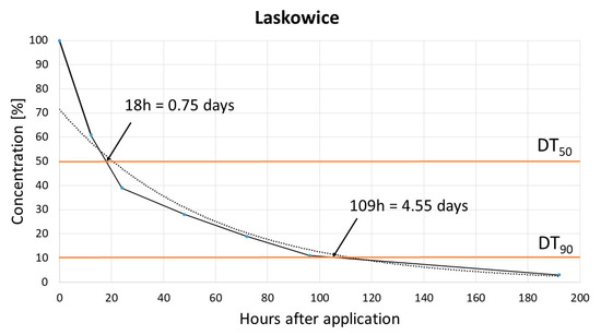 The dissipation study aimed to determine the DT50 (time for the concentration to reduce to 50% of its initial value, half life time) and DT90 (time for the concentration to reduce to 10% of its initial value) for pinocembrin dihydrochalcone. Results obtained in two different soils, Biostrateg and Laskowice, indicated that the dissipation of dihydrochalcone follows a single first-order (SFO) kinetic model with the determination coefficient (R2) 0.97. For Biostrateg, models DT50 and DT90 reached 1.3 and 5.46 days, respectively, while in the case of Laskowice, soil relevant values were 0.75 and 4.55 days, respectively [Figure 2 and Figure 3].