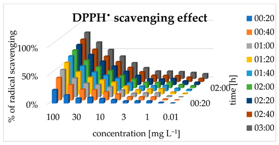 Antiradical activity (DPPH scavenging) was observed in the water solution within the tested concentrations. The scavenging effect depended on time and concentration, and the strongest effect was observed at the higher concentration of 0.1 mg mL−1, reaching a plateau after 1.5 h. As the concentration decreased, the time required to achieve peak activity increased correspondingly [Figure 5]. Referring to obtained results, the half maximal effective concentration (EC50) of pinocembrin dihydrochalcone was calculated to be 0.041 mg mL−1. This value is lower than the values of the range typically used in agricultural applications 0.3–0.6 mg mL−1.