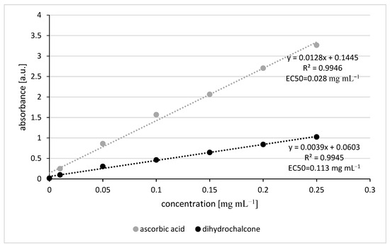 Therefore, in light of the proven fungicidal and bactericidal properties of pinocembrin dihydrochalcone, antioxidant properties were evaluated, because very often they occur parallelly. Dihydrochalcones are known as potent antioxidants, with their other bioactivities linked to their antioxidant properties [14]. Thus, determination of the antioxidant activity is crucial for evaluating their biodegradability in the environment. Antioxidants can impact decomposition processes by influencing radicals and redox reactions, which directly supports the rationale behind our experiments [15].