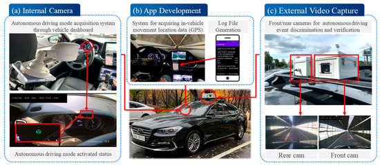 Devices installed for data collection: (a) an in-vehicle camera capturing the LKAS activation status; (b) a mobile application recording GPS coordinates and LKAS disengagement reasons; (c) external cameras capturing front and rear vehicle views.