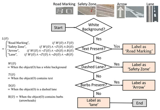Labeling decision process for lane-related objects, including road markings, arrows, safety zones, and lanes (both dashed and solid lines are labeled as “lane”).