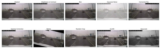 The original dataset consisted of 330 images collected at moments when autonomous driving functions (e.g., LKAS) were disengaged. Various data augmentation techniques—such as brightness adjustment, rotation, scaling, and random cropping—were then applied to reflect diverse road conditions, increasing the training dataset to 3304 images. Figure 6 presents examples of images generated by the augmentation algorithm. The corresponding process is described in Algorithm 1.