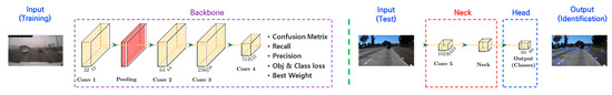 In the input stage, the trained images are fed into the model. In the backbone stage, the model generates an optimal weight file (best weight file) through training while simultaneously evaluating performance metrics such as the confusion matrix, recall, precision, and object and class loss. In the neck stage, the verified best weight file is used to assess the lane detection accuracy on new images. The head stage utilizes the outputs from the neck to detect the type and location of lanes. Finally, in the output stage, the model produces the lane identification results, including lane classes and positional information.