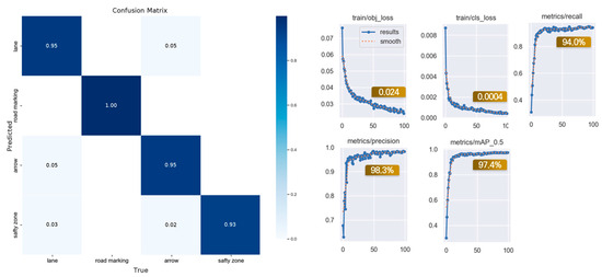 Training was conducted in a high-performance computing environment equipped with a 13th-generation Intel® Core™ i9-13900HK processor and an NVIDIA GeForce RTX 4080 GPU. The dataset was divided into 80% for training and 20% for validation. The XL model was trained for 100 epochs, with the confidence threshold set at 0.4 and the IoU threshold at 0.45. The batch size was set to 16 and the learning rate to 0.01, optimized using the SGD optimizer. Additionally, data augmentation techniques based on Mosaic and HSV transformations were applied to improve the model’s generalization performance. According to the confusion matrix analysis shown in Figure 8, object recognition accuracy ranged from 93% to 100%. Both object and class loss rates were low, and the model achieved a mean average precision (mAP) of 97.4%, a precision of 98.3%, and a recall of 94.0%, demonstrating excellent performance.