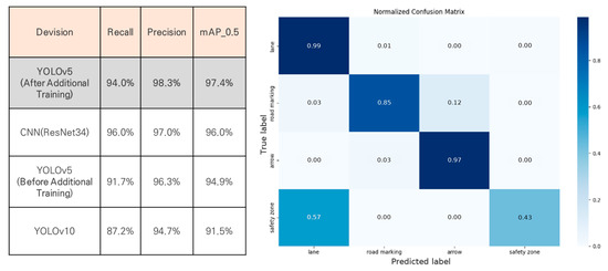 To evaluate the reliability of the training results, the performance of YOLOv5 was compared with a CNN (ResNet34) and other YOLO versions. As shown in Figure 9, we present both the pre- and post-training performance of YOLOv5 to highlight the impact of the additional training phase, which used low-visibility and faded lane images that were not included in the original training dataset. YOLOv5 achieved the highest performance after additional training, with a recall of 94.0%, a precision of 98.3%, and a mean average precision (mAP) of 97.4%. It outperformed the CNN (ResNet34), which achieved a precision of 97.0% and mAP of 96.0%, and surpassed YOLOv10, indicating the effectiveness of simpler algorithms in small-scale datasets.