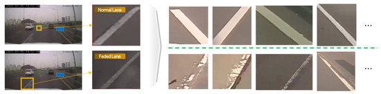 To develop the image processing techniques, it was necessary to extract individual lane images from the training data. In the original training images, both intact and worn lane markings were labeled together with the background, requiring separation from surrounding visual elements. To address this, approximately 1600 lane images containing background elements were extracted from the training dataset. The extraction process and resulting samples are presented in Figure 11.