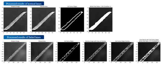 Figure 13 shows the analysis results for intact and worn lane markings. In intact lanes, few internal pixels were detected in the first Canny edge detection, indicating a good condition. In worn lanes, many internal pixels appeared initially but were removed through a second Canny detection and morphological operations, resulting in a low final pixel occupancy.