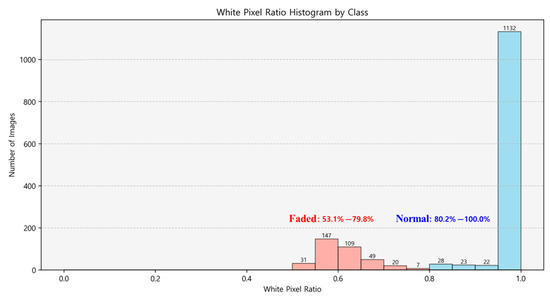 Figure 14 illustrates the pixel occupancy distribution for intact and worn lane markings, based on the lane evaluation algorithm shown in Figure 14. The analysis showed that intact lanes had pixel occupancy between 80.2% and 100.0%, while worn lanes ranged from 53.1% to 79.8%. Based on this, lanes with occupancy above 80% were classified as intact and those below 80% as worn. This threshold enables a quantitative assessment of lane degradation and supports consistent evaluation across various road environments. Although the effective data range starts from approximately 0.4, the figure retains the full 0.0–1.0 scale to ensure consistency and transparency in visual representation.