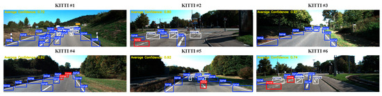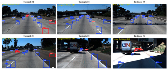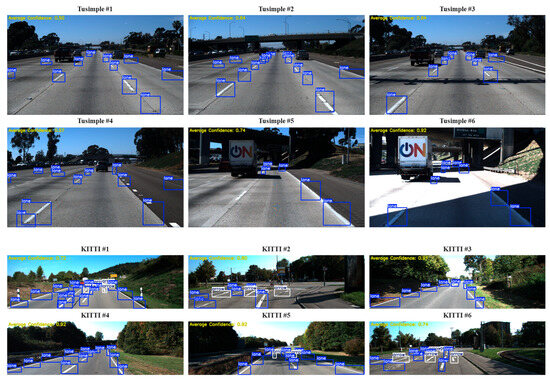 To evaluate the generalization performance of the lane identification algorithm, accuracy was tested on new images. Six arterial road images were selected from each of the KITTI and TuSimple datasets. As shown in Figure 15, the average intersection over union (AIoU) ranged from 0.64 to 0.92, reflecting the accuracy of the predicted object locations.