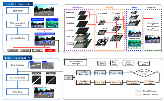 Framework for lane identification and condition assessment: (a) Lane identification algorithm using YOLOv5 to detect various road markings and isolate objects classified as “lane” for further evaluation. (b) Lane condition assessment algorithm that determines whether each lane is faded or normal through pixel-level edge detection and morphological processing; the assessment logic is embedded in the head stage of the YOLOv5 architecture to enable integrated lane detection and degradation analysis.