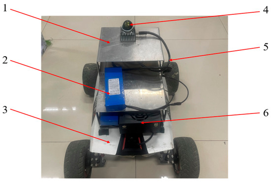 Canopy parameter detection system. 1. Fixed bracket; 2. power supply; 3. self-propelled cart; 4. LiDAR sensor; 5. transmission cable; 6. industrial personal computer.