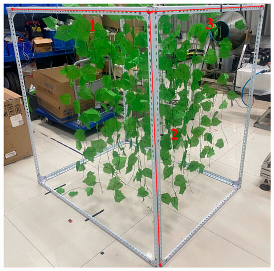 To explore the precise relationship between the area of laser point cloud-fitted leaves and the canopy leaf area density in an orchard, and to establish a mathematical model for calculating the canopy leaf area density, this research builds a laboratory-simulated test bench, with reference to the actual conditions of an orchard canopy. The test bench is shown in Figure 3. To facilitate the calculation of canopy volume, this research constructs the simulated canopy in a rectangular cuboid structure. The simulated canopy test bench is constructed using aluminum profiles, transparent lines, and artificial leaves. The aluminum profiles and transparent lines are used to fix the artificial leaves and effectively simulate the branch and trellis structure found in actual orchard canopy, while the artificial leaves are used to mimic real leaves. The specific dimensions of the simulated canopy are set as follows: canopy length is 1 m, canopy thickness is 1.3 m, and canopy height is 1 m. The artificial leaves are uniformly arranged in the detection area beneath the frame, with 3 to 13 layers placed along the direction of detection. The distance between each layer is 10 cm. By adjusting the number of layers and the quantity of artificial leaves, it is possible to simulate canopy conditions with varying canopy thicknesses and leaf area densities, thereby meeting the diverse requirements of the experiment.