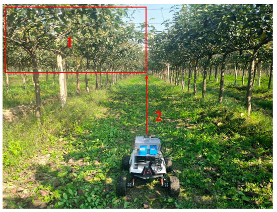 In existing studies, unmanned aerial vehicles (UAVs) equipped with LiDAR are commonly used to measure fruit tree canopy information [11,27,28,29]. The acquired point cloud data is utilized to locate the target canopy or is further processed to calculate the volume of the target canopy, providing guidance for field operations. To further enhance accuracy, researchers calculate the leaf area of the target canopy based on the point cloud data obtained from LiDAR using the voxel-based inversion method. This research measures the leaf area of orchard canopies using a ground robot equipped with LiDAR. When traveling in the orchard, the ground robot is less affected by environmental factors such as wind and airflow, enabling it to maintain a relatively stable motion trajectory and attitude. This reduces the distortion and errors in point cloud data caused by platform shaking, thereby improving the stability and accuracy of data collection. The orchard studied in this research employs a horizontal trellis cultivation system, with metal mesh structures above it. The use of UAVs for measurement would introduce point cloud noise. However, the measurement system in this research had difficulty covering the top regions of the fruit tree canopies, failing to obtain more comprehensive three-dimensional information. This will be further considered for different application scenarios in later research.