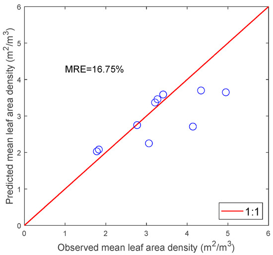 The experimental results for the orchard are shown in Figure 5 below. The absolute average relative error of observed mean leaf area density and predicted mean leaf area density is 16.75% and maximum and minimum errors are 34.58% and 0.77%. When sampling occurs at the junction of the canopies of two trees, the leaves are concentrated on both sides of the sampling area, while the point cloud in the middle is relatively sparse, which can lead to missed and false detections of the canopy. When the leaf area density at the sampling point is below , the average relative error is 10.14%. The leaf area density detection based on the fitted leaf method demonstrates good applicability and accuracy. Within a certain range of leaf area density, the leaf area density detection method based on the fitted leaf approach demonstrates good applicability and accuracy.