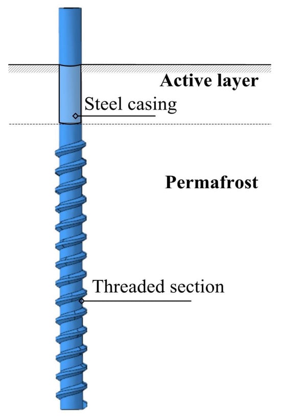 The permafrost regions in the typical wet section of the Qinghai–Tibet Plateau were selected as the study site [14]. The pile’s length is 14 m, the diameter of the pile’s body is 0.8 m, the diameter of the pile’s side is 1.1 m, and the thread spacing is 0.65 m. The upper section, in the 2.6 m deep seasonal activity layer, has no thread, and the surface is in contact with the frozen soil via the steel sleeve.