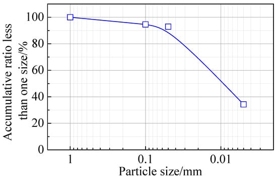 The body of the test pile is made of aluminum alloy. The length of the conventional, ordinary pile is 40 cm, and it has a diameter of 4.5 cm. The screw pile has a length of 40 cm, an inner diameter of 4.5 cm, an outer diameter of 6 cm, a pitch of 4 cm, and a thread width of 1.2 cm. Strain gauges were arranged symmetrically on both sides of the pile’s body, with seven groups placed for a single pile. The pile’s body was placed in the test chamber for loading. The diameter of the test chamber was 45 cm, and the depth was 65 cm. The soil width range around the pile was 45 cm, and the soil depth was 2 times the pile length, making it 80 cm, which can simulate the bearing capacity characteristics of the pile’s body in the semi-infinite stratum, as indicated in Figure 1. Temperature sensors were installed every 10 cm in a downward direction along the depth of the soil in the model test chamber, with a total of 8 temperature sensors, to test the soil temperature. Standard loess from Lanzhou, China, was selected for this test, with a density of 1650 kg·m−3. The liquid limit was 24.6%, and the plastic limit was 17.7%. Figure 2 depicts the particle size distribution curve of standard loess. The collected standard loess soil sample was mixed with water, and the water content was set at 21%. A heavy hammer was used to compact every 5 cm of soil, and each layer’s compaction work was controlled at approximately 50.6 kJ∙m−3. Once the pile–soil model was created, it was placed in a low-temperature environmental test chamber and frozen for 3–4 days until the temperature reached the test value of −0.5 °C. This temperature condition corresponds to high-temperature frozen soil [14].