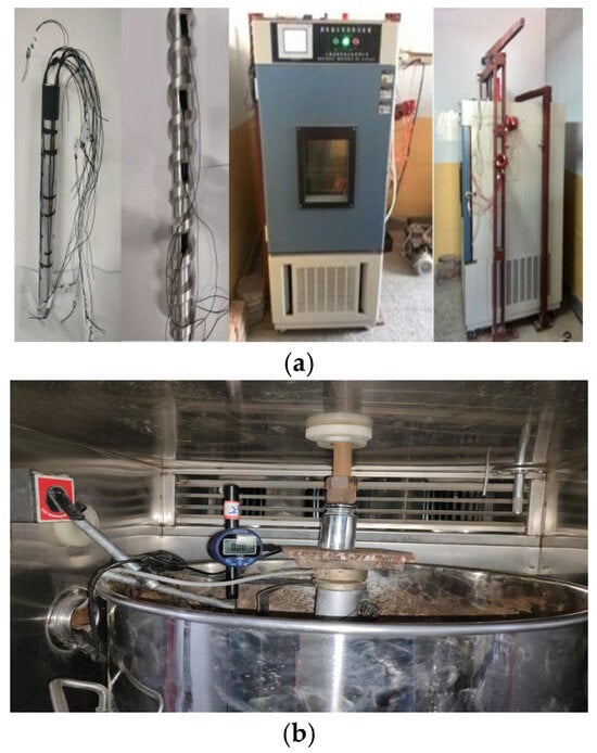Test equipment system: (a) Model pile, low-temperature test chamber, and loading system. (b) Loading displacement and pressure acquisition system.