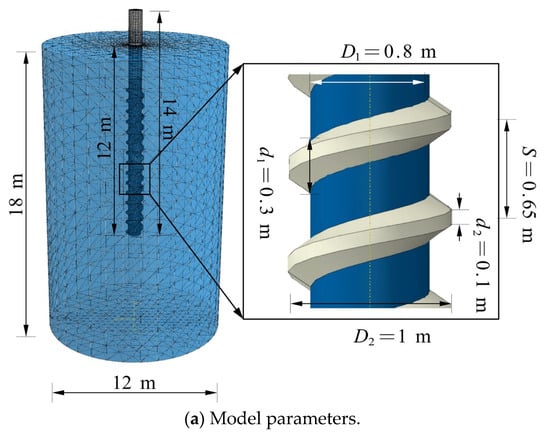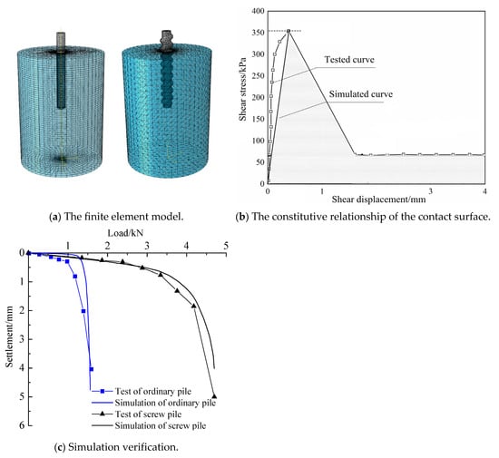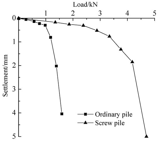 The comparison between the model test results and the simulation results is depicted in Figure 6c. The settlement of the ordinary pile is small before failure, and its ultimate failure load is consistent with the test results. The initial stage of the screw pile’s load-settlement curve fits well with the test results, and its failure load is also close to that seen in the test results. Generally, the numerical analysis results are in good agreement with the experimental results, verifying the reliability of the numerical method.