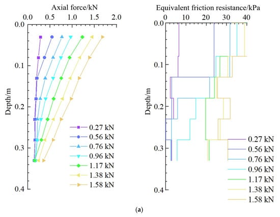 Figure 5 indicates the axial force and the equivalent frictional resistance of the model piles. It can be observed from the figure that the axial force on the ordinary pile’s body gradually decreases along the depth, and the lateral friction resistance of the pile begins from the top of the pile, with the increase of the load, and then gradually reaches the maximum shear strength of 35 kPa. The axial force on the screw pile changes sharply, and the equivalent friction resistance of the pile’s side indicates non-uniformity, and the friction resistance of the pile’s top develops first with the increase of the load. Generally, the equivalent friction resistance on the side of a screw pile is significantly greater than that of the ordinary pile.